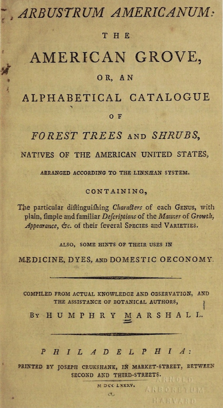 Humphry Marshall is most important as the author and publisher of the first book written by an American about our native trees and shrubs. This book named Arbustrum Americanum, printed 1785 was innovative by utilizing the recently developed Linnean plant taxonomy or naming system.